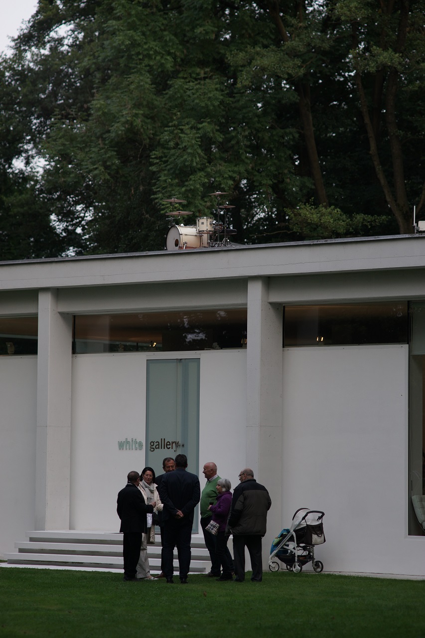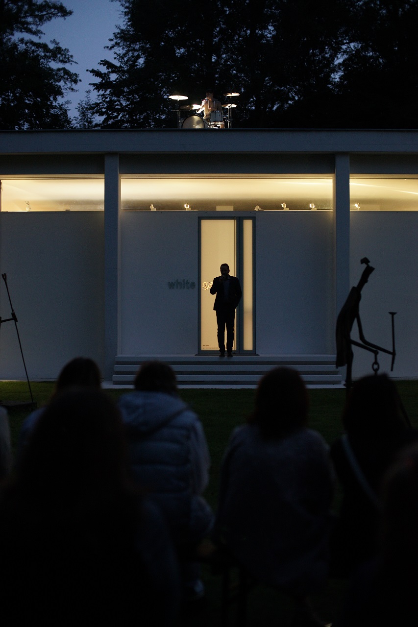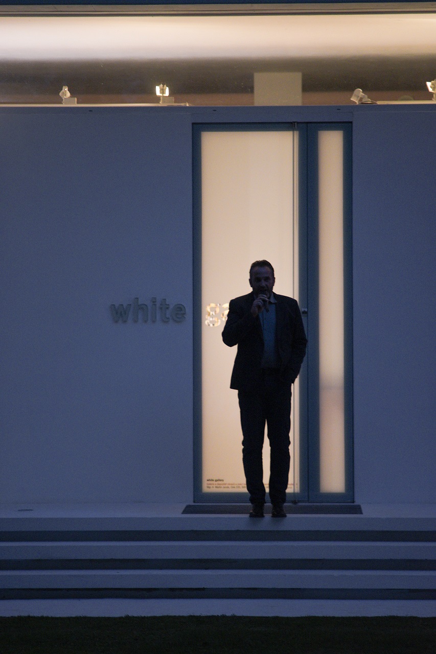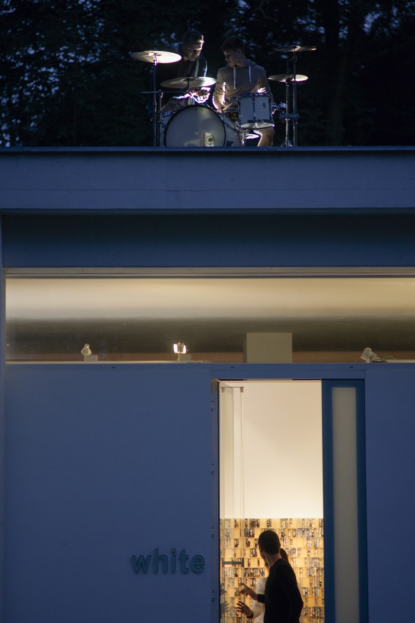 Součástí večera bylo hudební vystoupení Čeňka Chlebouna s vlastní improvizací na bubny umístěné na střeše White Gallery.