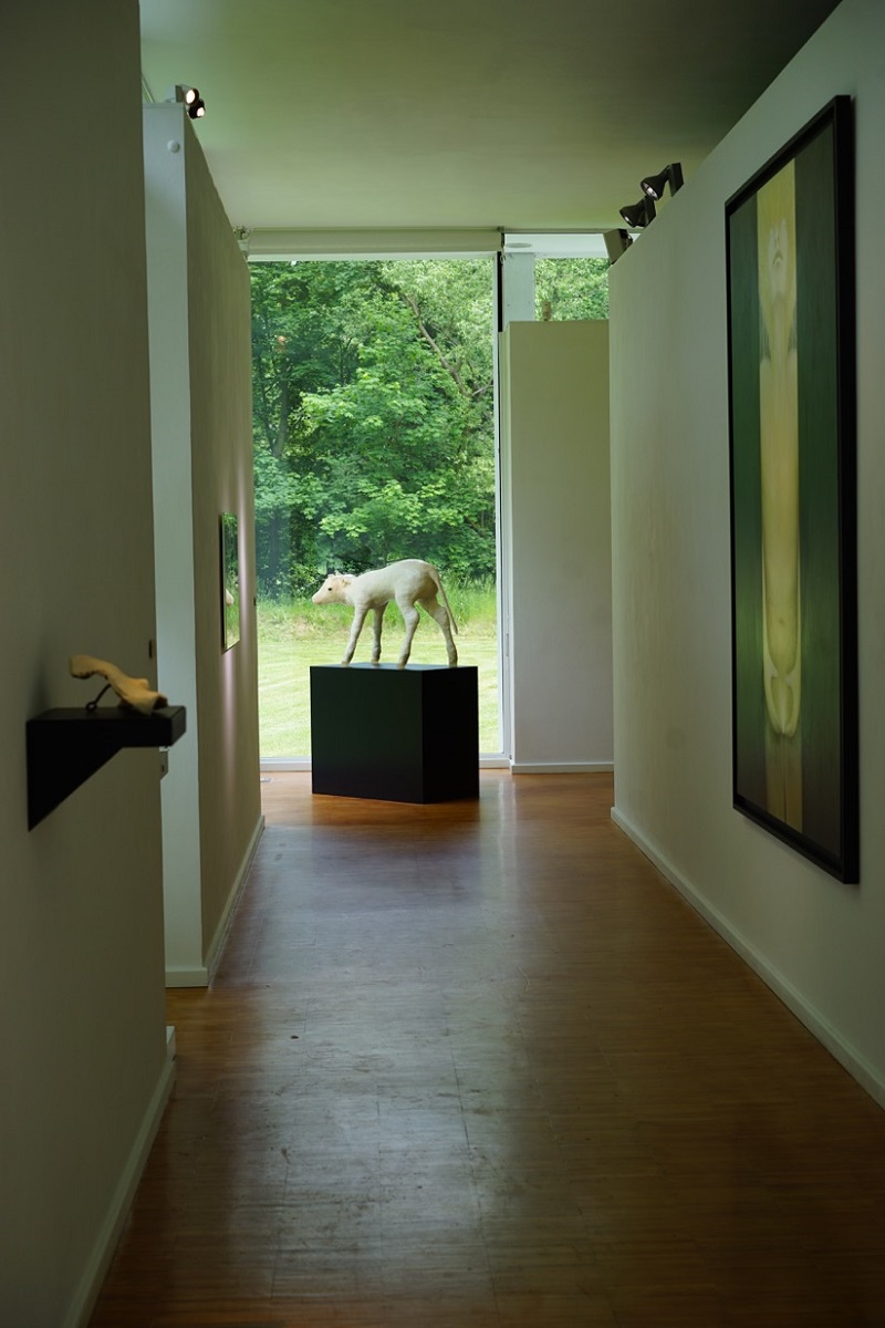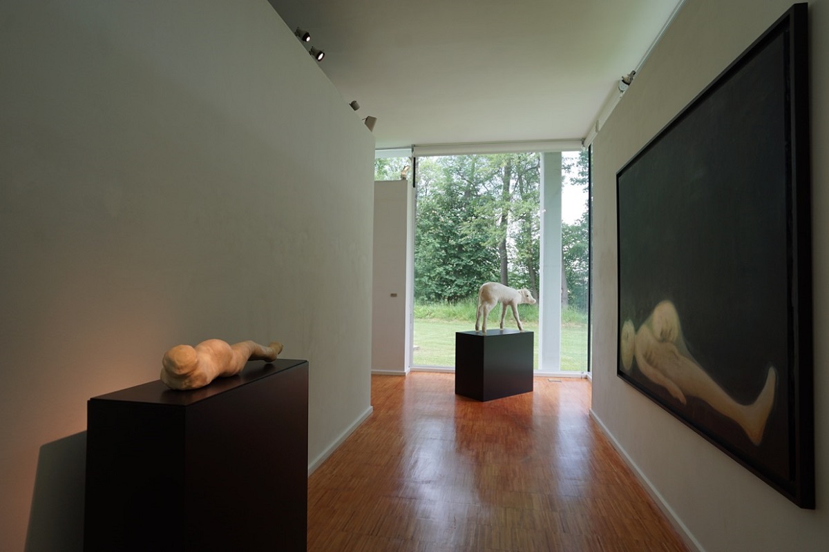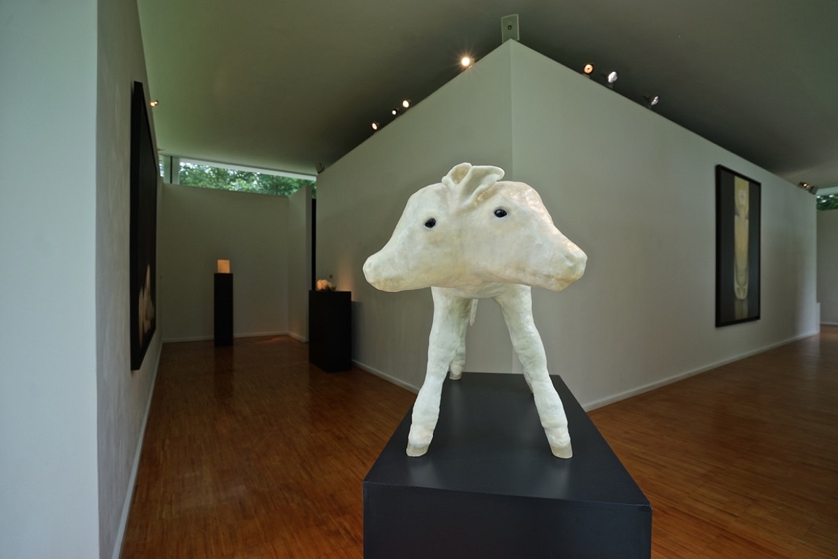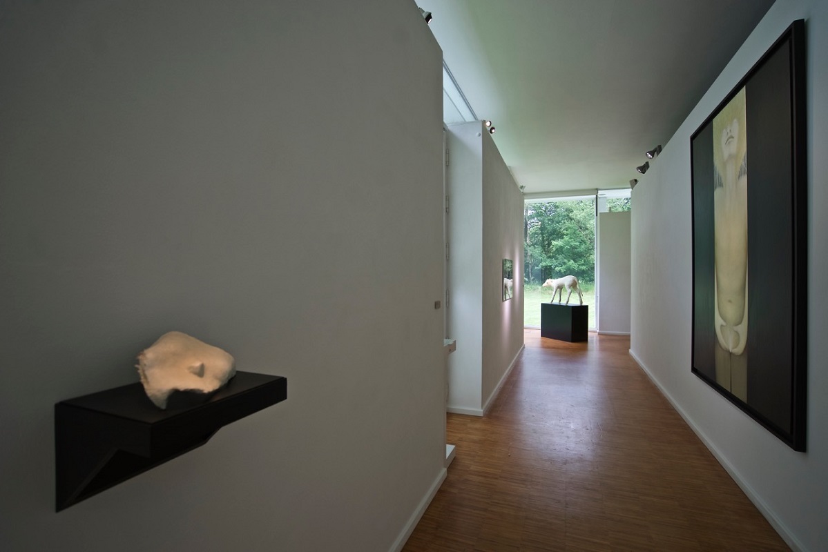 As is the custom at the White Gallery, the exhibition expands beyond the confines of the building. In Pešta’s case, this happens through his conceptual work Gravitation Zero II. Here, Pešta connects the exhibition’s interior and exterior portions using a two-headed wax animal entitled Double Face that evokes the idea of the “nocturnal” schizophrenia of dreams. The brilliantly modelled two-headed wax calf, combined with how he uses the heads to frame the building’s glass surface, creates a strong emotional experience and subliminally evokes the question of how far artificial genetic manipulation can go, and how it might be abused.