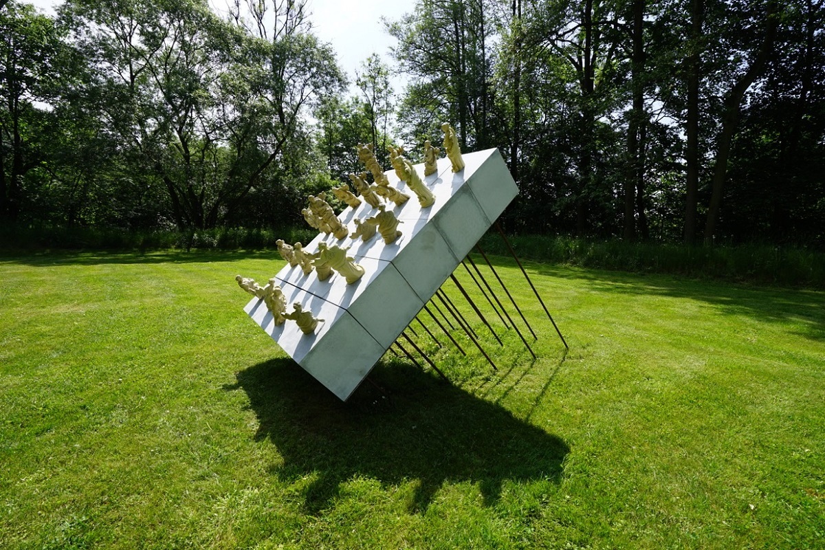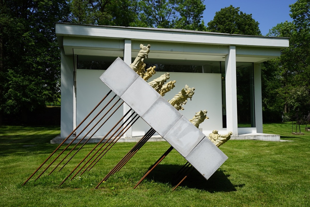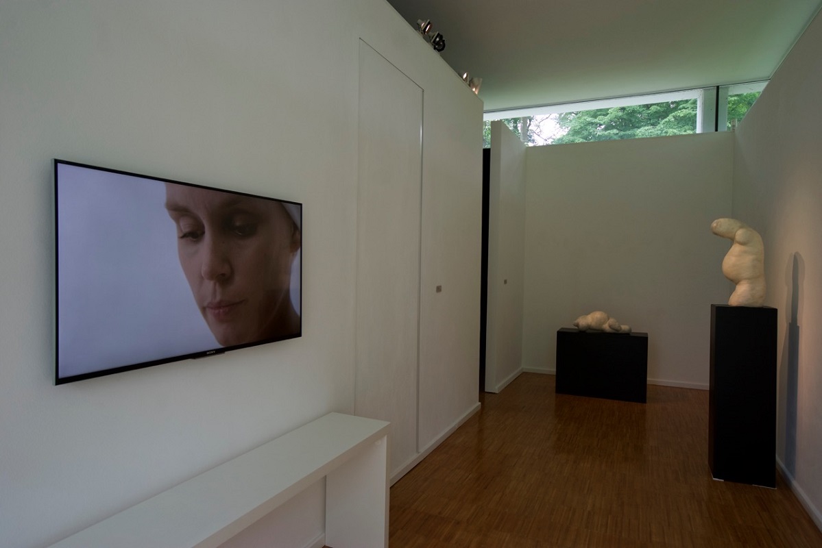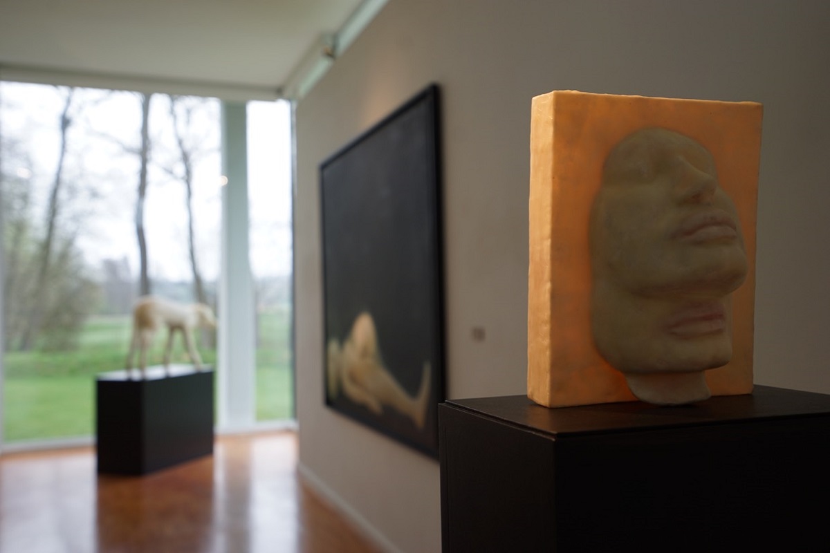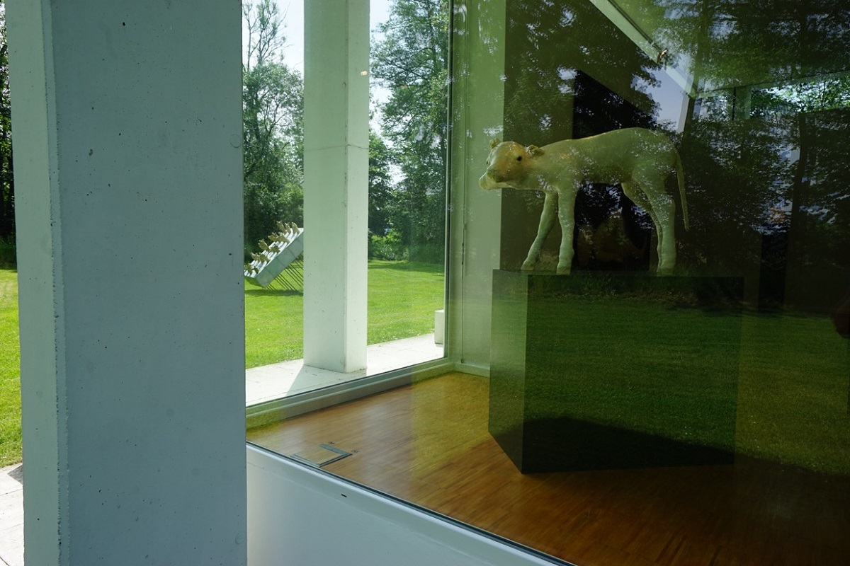As is the custom at the White Gallery, the exhibition expands beyond the confines of the building. In Pešta’s case, this happens through his conceptual work Gravitation Zero II. Here, Pešta connects the exhibition’s interior and exterior portions using a two-headed wax animal entitled Double Face that evokes the idea of the “nocturnal” schizophrenia of dreams. The brilliantly modelled two-headed wax calf, combined with how he uses the heads to frame the building’s glass surface, creates a strong emotional experience and subliminally evokes the question of how far artificial genetic manipulation can go, and how it might be abused.