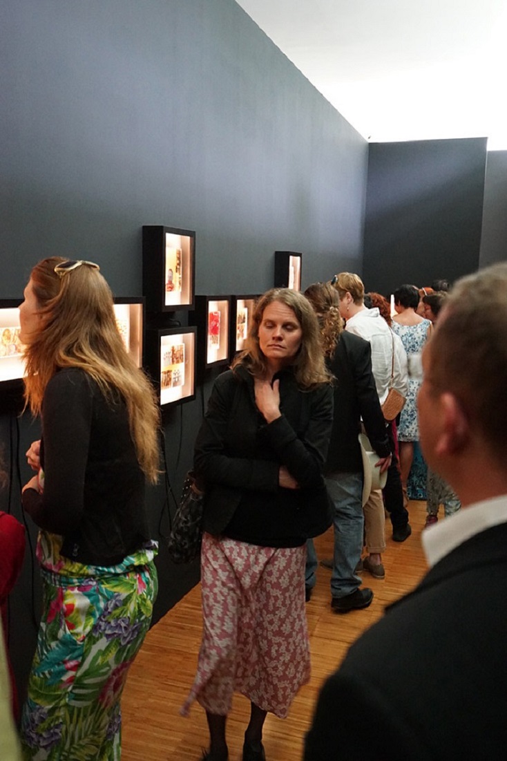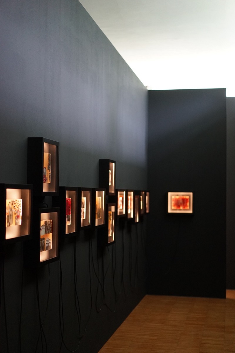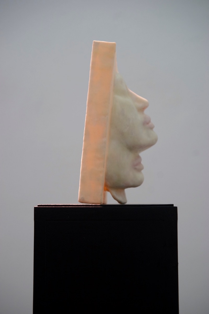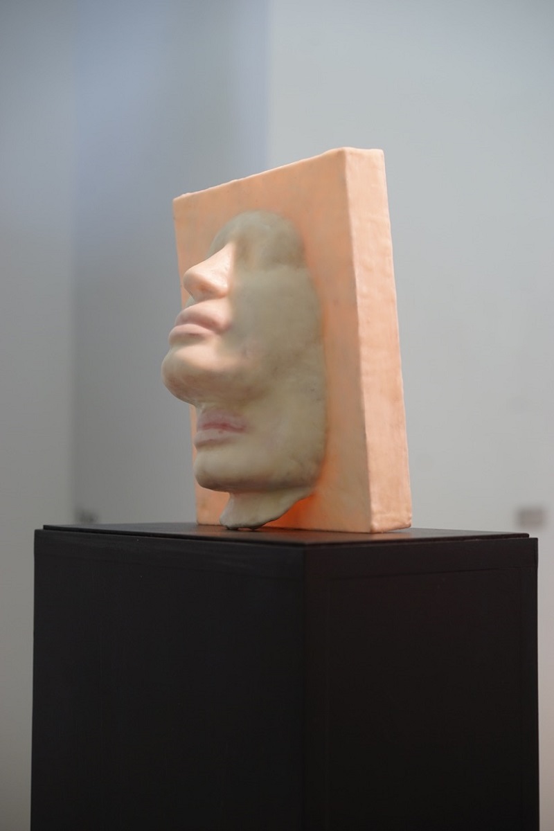 The exhibition’s central theme is reflected in a series of dreamlike poetic assemblages that have been roughly enclosed in blocks of more or less transparent resin, through which Pešta offers the viewer a glimpse into his subconscious. In parallel timelines consisting of flashes of personal memories, he layers the visual fragments of stories with the reflections that they inspire. Using period photographs from family albums, he further works the images by rolling them up, layering them, or tying them with a bright red thread that he often uses to stitch masks or muzzles onto the faces, thus responding to the helplessness or passion of the depicted individuals imprisoned within. The story is truly frightening, its profundity underscored by the manner in which the works are mounted – Pešta uses illuminated frames so that the light by which the viewer sees the work comes from the work itself. He is not “only” satisfied with illuminating the work; through their profundity, he uses the works to illuminate the viewers, making them a part of the story. To this end, the space in which the assemblages are exhibited is enclosed in an artificially created “black box” that sensitively adds to the White Gallery’s interior layout and creates a space for calming the viewer, or rather for drawing him into the work in this most intimate part of a sophisticated exhibition design. The rest of the exhibition, consisting of paintings and sculptures, forms an antithesis to this twilit space. Besides large-format paintings and emotionally fragile objects made of canvas and wax, this section also emphasis the artist’s use of media in the form of a video projection. In it, Pešta shows off his broad aptitude as a multimedia artist, making brilliant use of sound and video to underscore the exhibition’s main theme by working with the motif of two women in the advanced stages of pregnancy grooming each other’s hair – a picture of fragility and the uniqueness of the birth of human life.