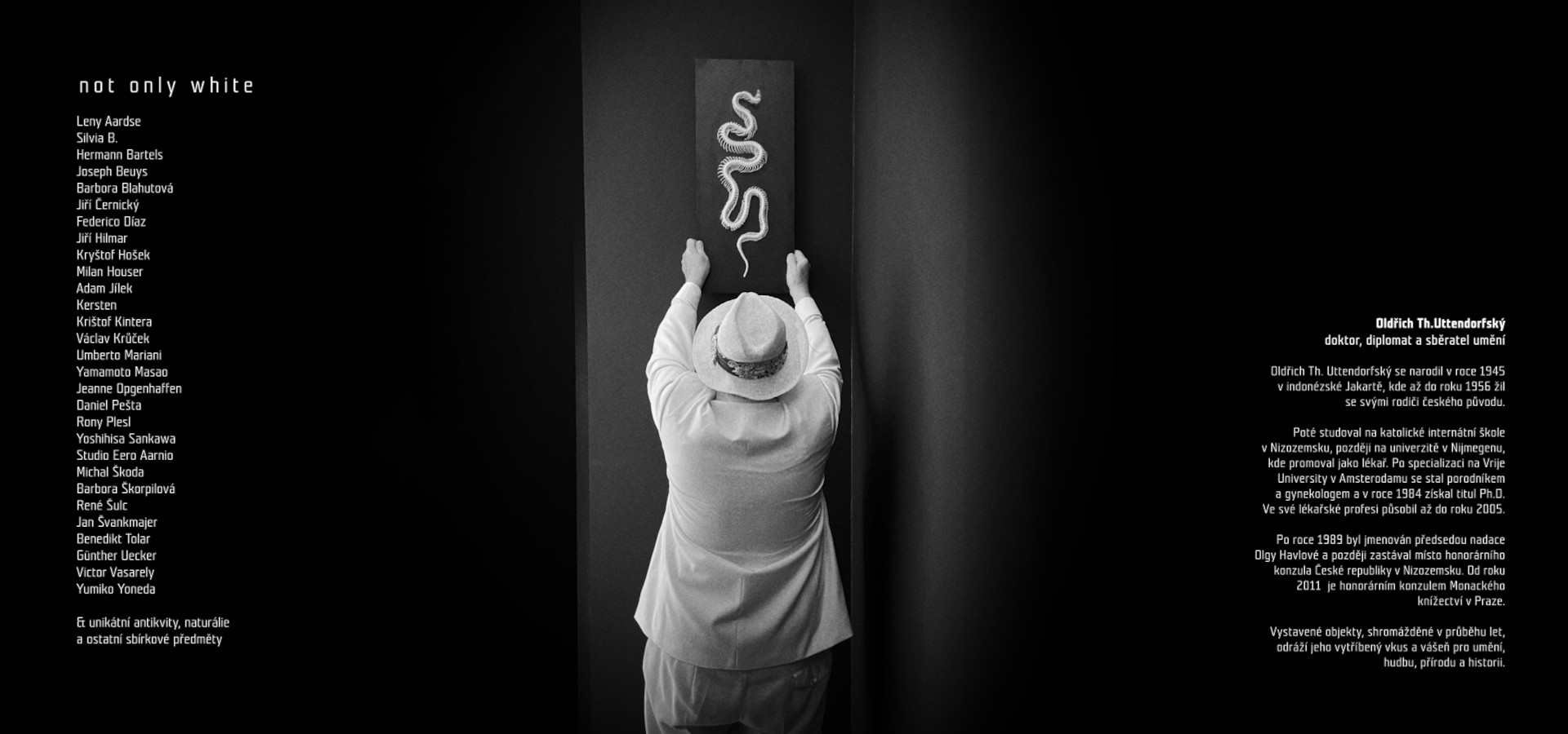 Symbolika bílé barvy se v různých kulturách projevuje velice pestrým způsobem. V mnohých civilizacích odlišných vyznání však mnohokrát značí obdobné konotace. Bílá velice často symbolizuje počátek a zrození. Toto téma je panu Uttendorfskému velice blízké, neboť většinu svého profesního života strávil jakožto gynekolog a porodník, který byl u obrovského množství porodů. Tento fakt a zaujetí anatomií je znatelný v charakteru jeho sbírky, jež obsahuje mnoho děl s tematikou zrození. Neméně děl je dedikováno pravému opaku počátku, totiž smrti a principu memento mori. A není to jistě náhoda, že zejména asijské kultury interpretují bílou barvu jako symbol smrti. Nejsymboličtějším znakem smrti je pak bezesporu kostlivec, jehož vápníková bílá barva je společná všem živým bytostem disponujícím skeletonem. Bílá barva však také v mnohých kulturách kromě počátku a konce vyjadřuje iniciaci, transformaci a možnost vzniku něčeho nového – tabula rasa. Tento nepopsaný list je signifikantní pro většinu umělců, neboť prázdný papír velice často předchází vzniku všech nových výtvarných děl. Zastoupení umělců ve sbírce Oldřicha Th. Uttendorfského je široké a lze jej roztřídit do tří kategorií. První tvoří prastaré umění dávných civilizací a většinou neznámých autorů. Ve druhé nalezneme celosvětové umění posledních sta let, přičemž jsou zde zastoupena věhlasná jména jako například Joseph Beuys, Günther Uecker nebo další členové významné skupiny Zero. Poslední část pak tvoří moderní a současné české umění a i zde můžeme najít mnoho zvučných jmen. Snad nejpodstatnějším aspektem sbírky Oldřicha Th. Uttendorfského je však její ryzí autentičnost, se kterou k jejímu budování přistupuje. Dle jeho vlastních slov stojí za celým vznikem sběratelské tendence enormní dávka zvědavosti, kterou pan Uttendorfský chová ke všem krásným vjemům našeho světa.
